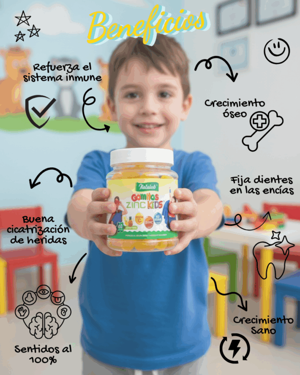 Gomitas Zinc Kids con zinc, betaglucano y vitamina C, refuerzan defensas, apoyan crecimiento óseo y salud dental infantil.